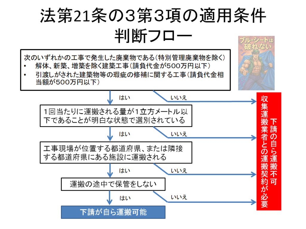 最後に、廃棄物処理法第21条の3第3項適用条件の判断フローを掲載しておきます。