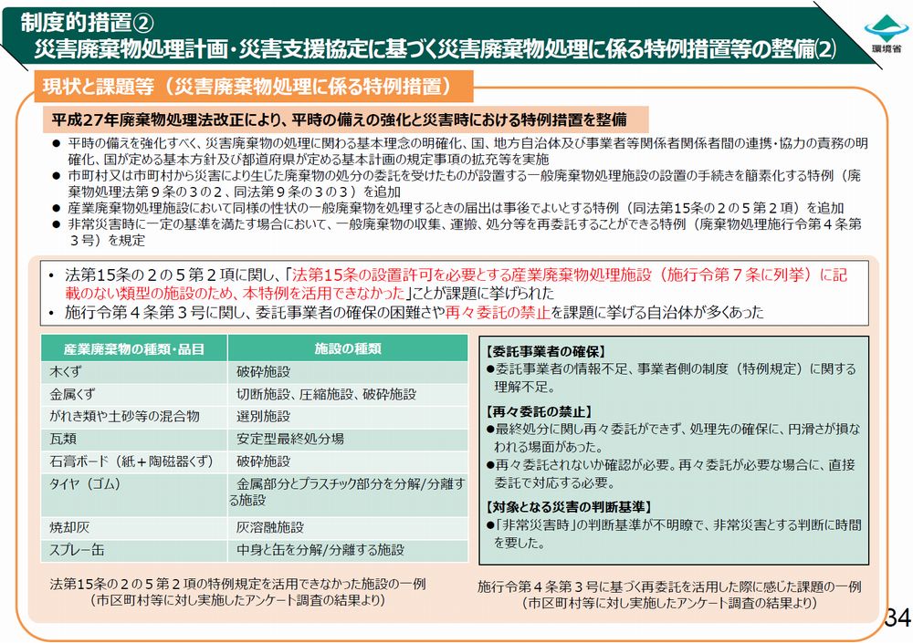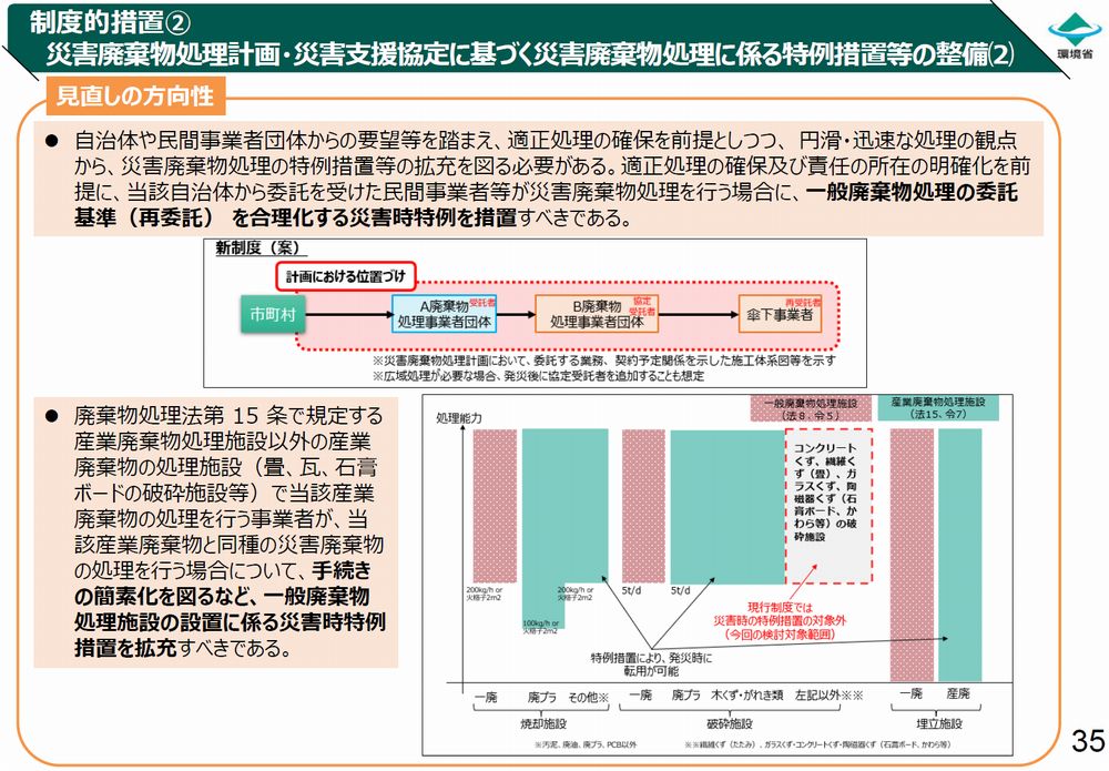 「産業廃棄物処理業者が、当該産業廃棄物と同種の災害廃棄物の処理を行う場合については、手続きの簡素化を図るなど、一般廃棄物処理施設の設置に係る災害時特例措置を拡充すべき」とされています。