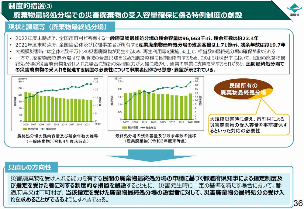 「災害廃棄物の最終処分の受け入れを求めることができるようにすべき」という一文に、個人的には「私有財産の侵害」というきな臭さを感じてしまいました。