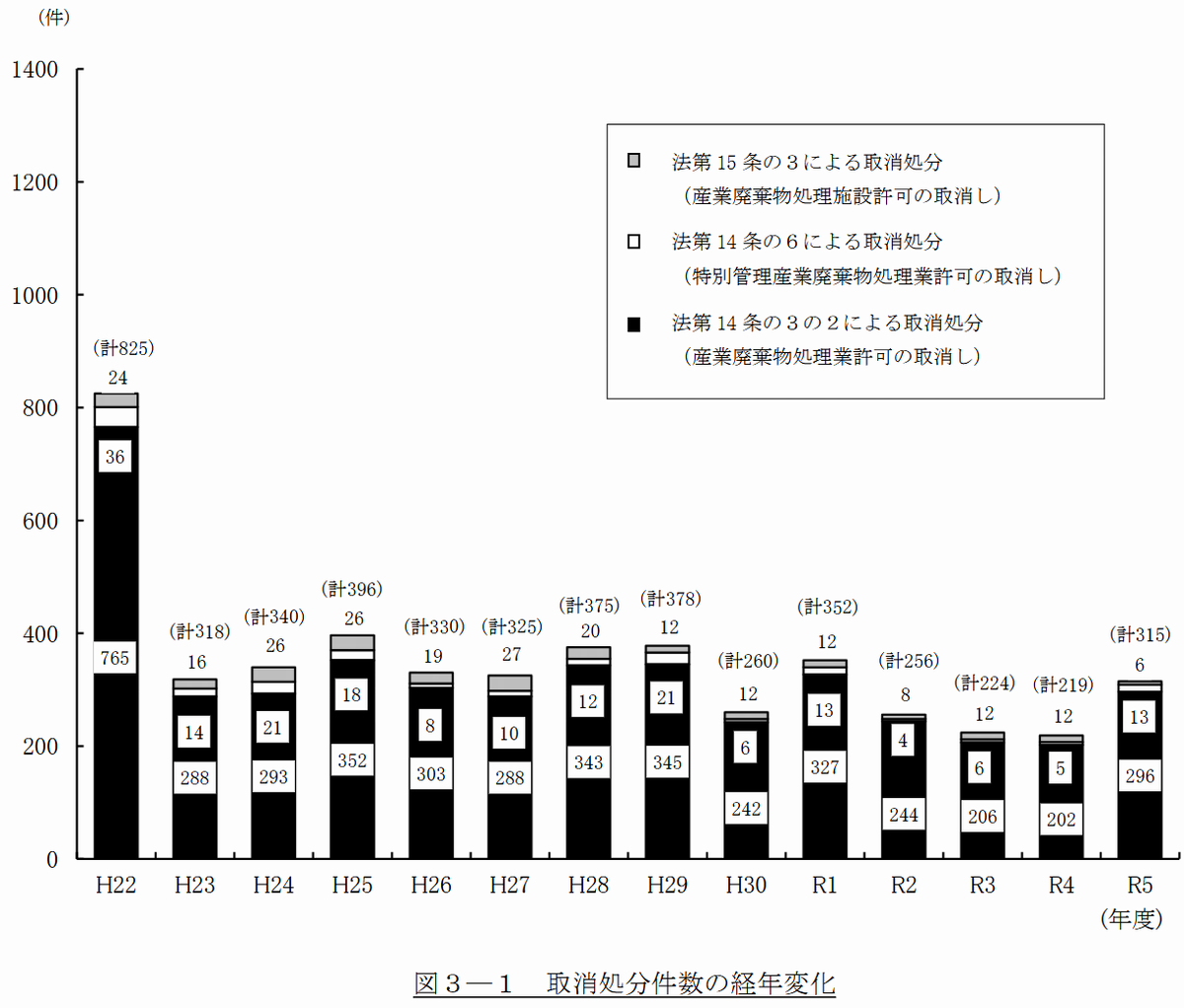 - 産業廃棄物処理業の許可取消:316件(許可取消+事業の全部停止)