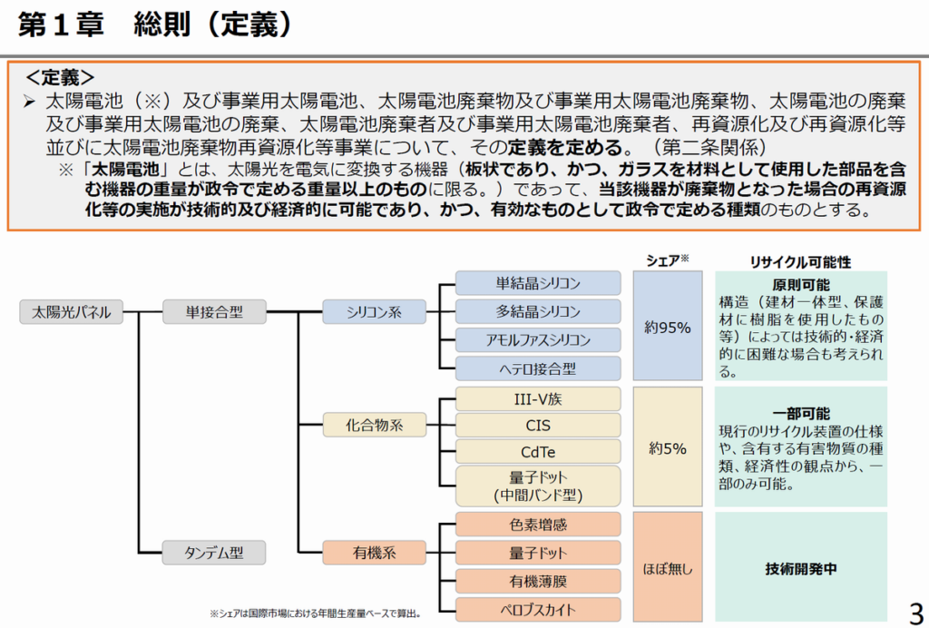 今回は、「3」の法律案の対象となる「太陽電池」の定義を考察していきます。